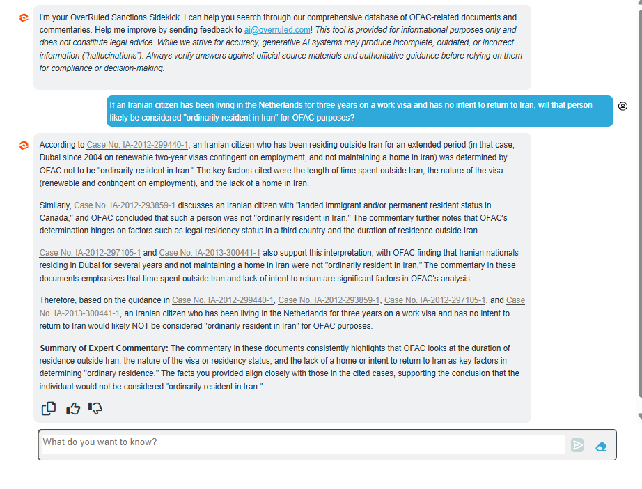 I'm your OverRuled Sanctions Sidekick. I can help you search through our comprehensive database of OFAC-related documents and commentaries. Help me improve by sending feedback to ai@overruled.com!